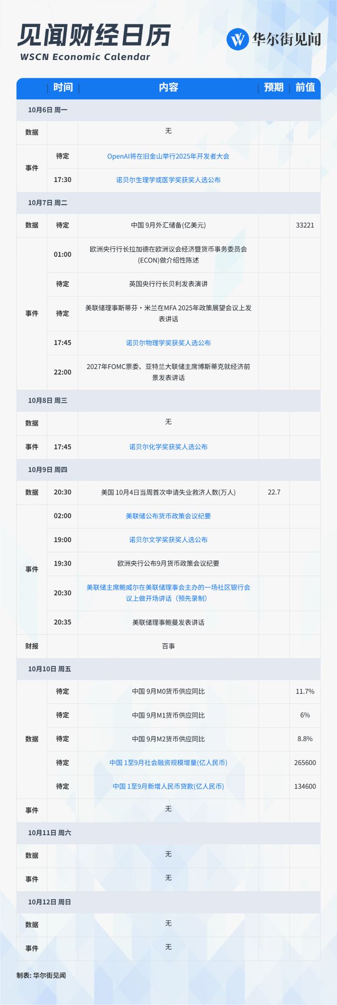下周重点关注:OpenAI年度开发者大会、美联储货币政策会议纪要、鲍威尔、拉加德等央行行长讲话,中国9月金融数据及外储数据,同时诺贝尔奖项将陆续揭晓。